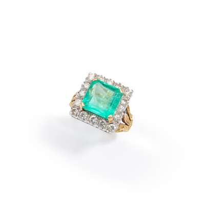 the square step-cut emerald within a brilliant-cut diamond surround, between fleur-de-lys shoulders