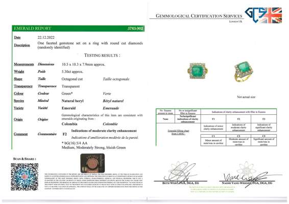 Accompanied by a GCS report stating that the emerald, weighing approx. 5.30ct, is of Colombian origin, with indications of moderate clarity enhancement. Report no. 5783-902, dated 22nd December 2022.