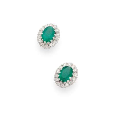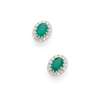 each claw-set with an oval-cut emerald, in a border of fourteen brilliant-cut diamonds, post and butterfly fittings, stamped 18k
