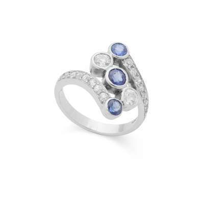 collet-set with three circular-cut sapphires and two old brilliant-cut diamonds, the shoulders set with old and cushion-cut diamonds, mounted in platinum