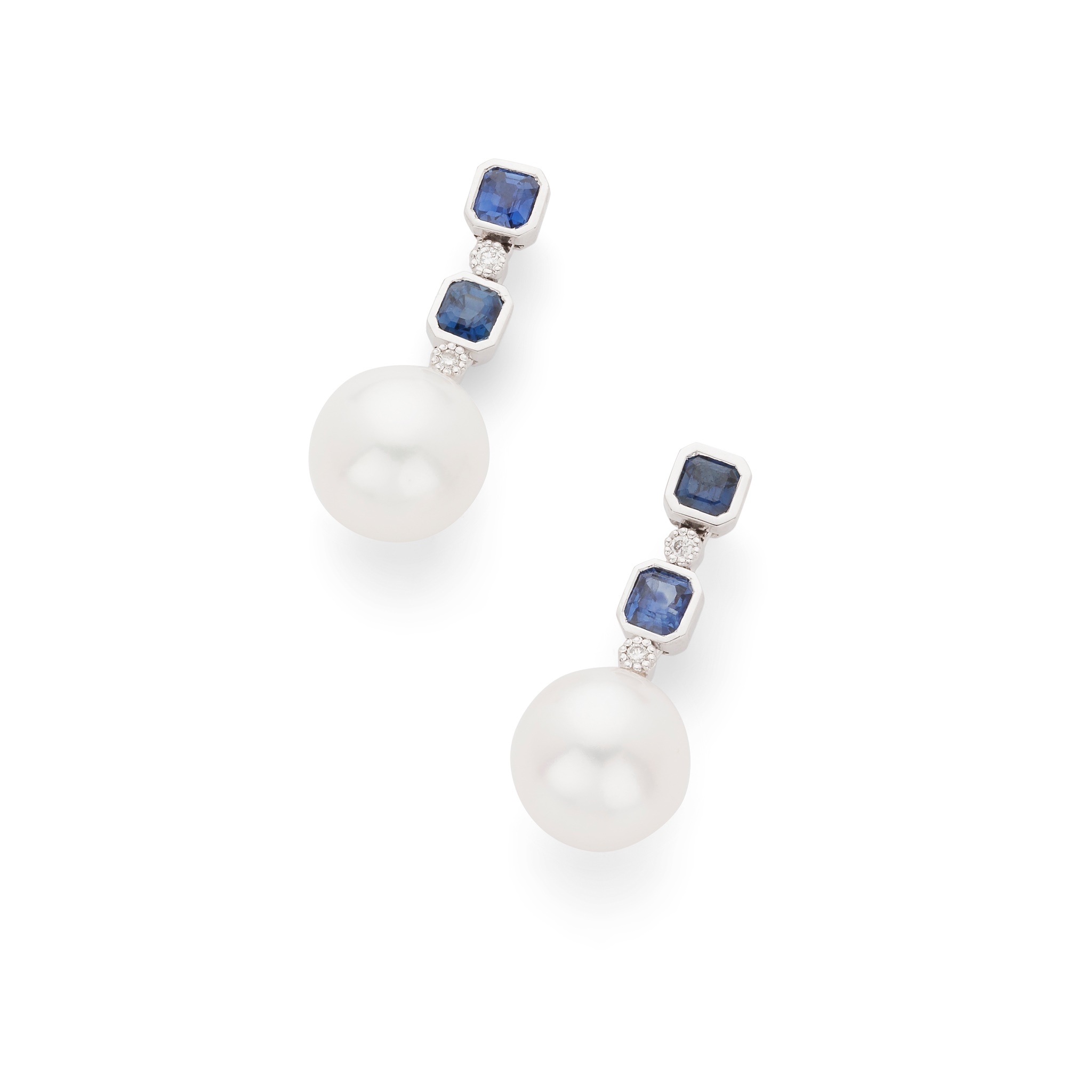 A pair of cultured pearl, sapphire and diamond pendent earrings