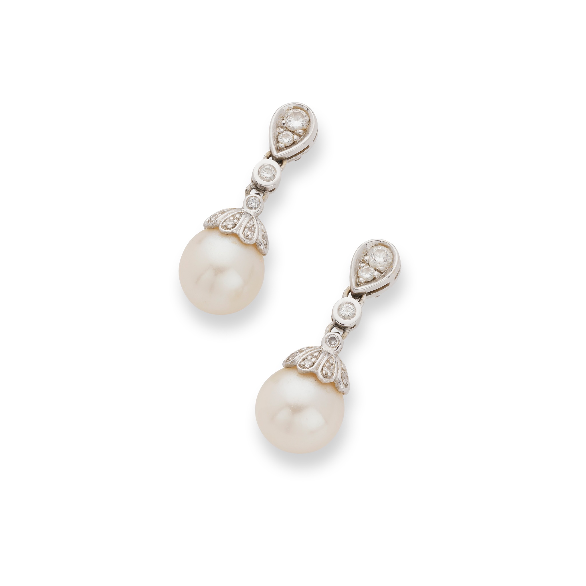 each suspending a cultured pearl from a brilliant-cut diamond surmount, post and butterfly fittings, unmarked