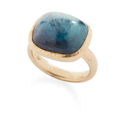 collet-set with a blueish green cabochon tourmaline, mounted in 18ct gold