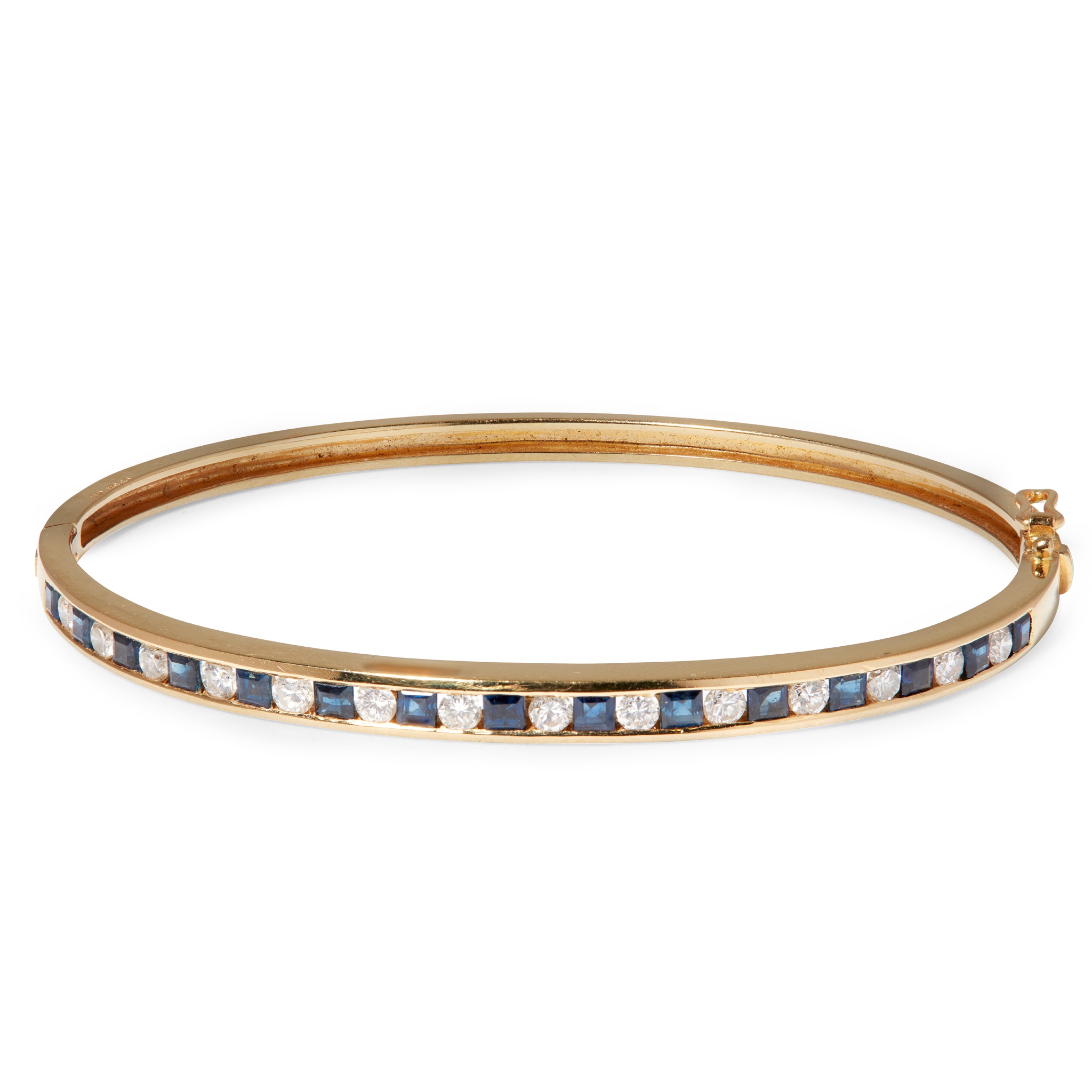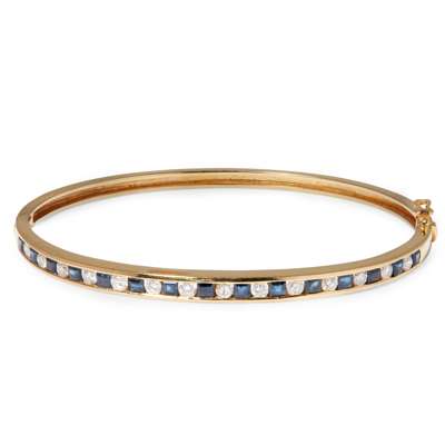 the bangle of hinged design, channel-set with alternating brilliant-cut diamonds and square step-cut sapphires, stamped 750; together with a matching ring, mounted in 18ct gold