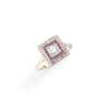 claw-set with a brilliant-cut diamond in a square border of calibré-cut rubies and single-cut diamonds, stamped 18ct