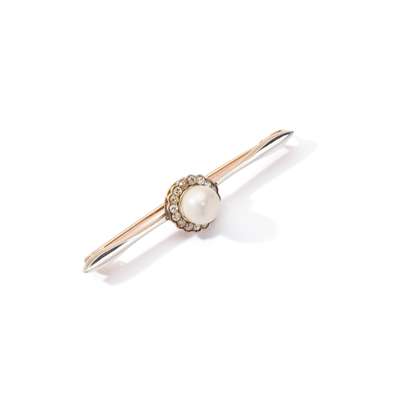 set with an 8.1mm pearl within a millegrain-set old-cut diamond surround, to a tapered bar, pearl untested