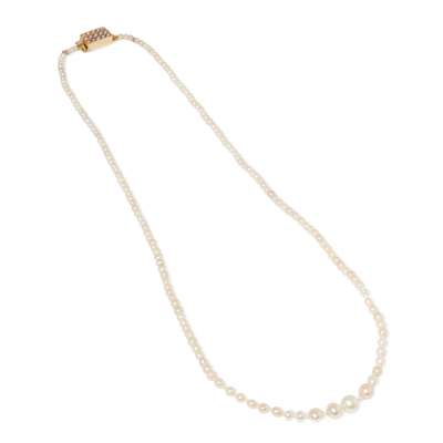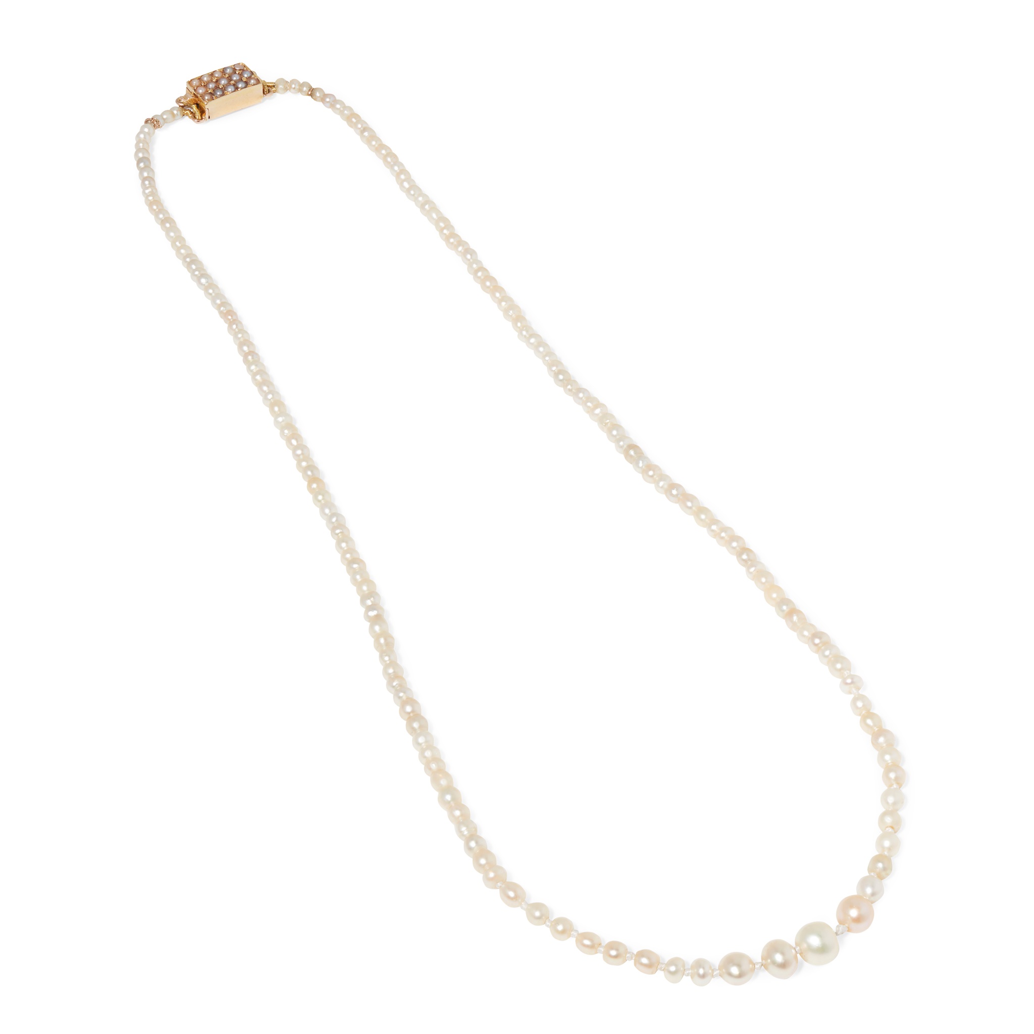 composed of a single row of graduated pearls, the box clasp set with seed pearls, unmarked, pearls untested