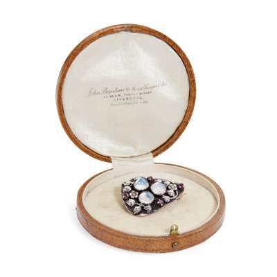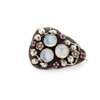 of stylised floral design, set with three cabochon moonstones and four cabochon garnets, unmarked