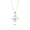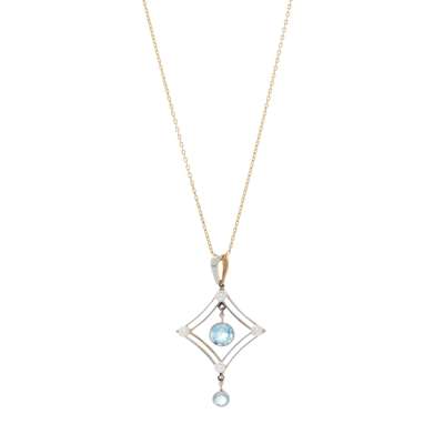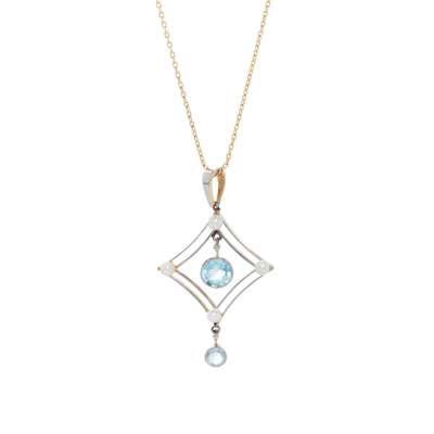 of pierced square outline, millegrain-set with two circular-cut aquamarines and four seed pearls, unmarked; to a trace-link chain, stamped 9c; in a fitted box for Hamilton & Inches ... Edinburgh