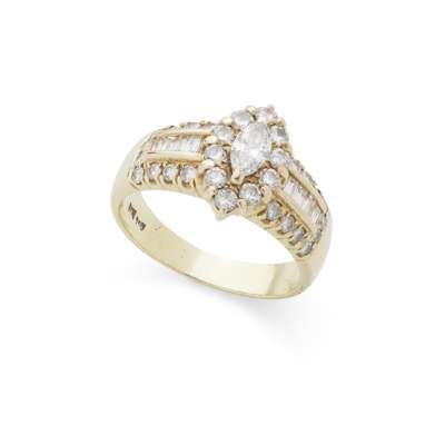 claw-set with a marquise-cut diamond, in a border of brilliant and baguette-cut diamonds, stamped 750