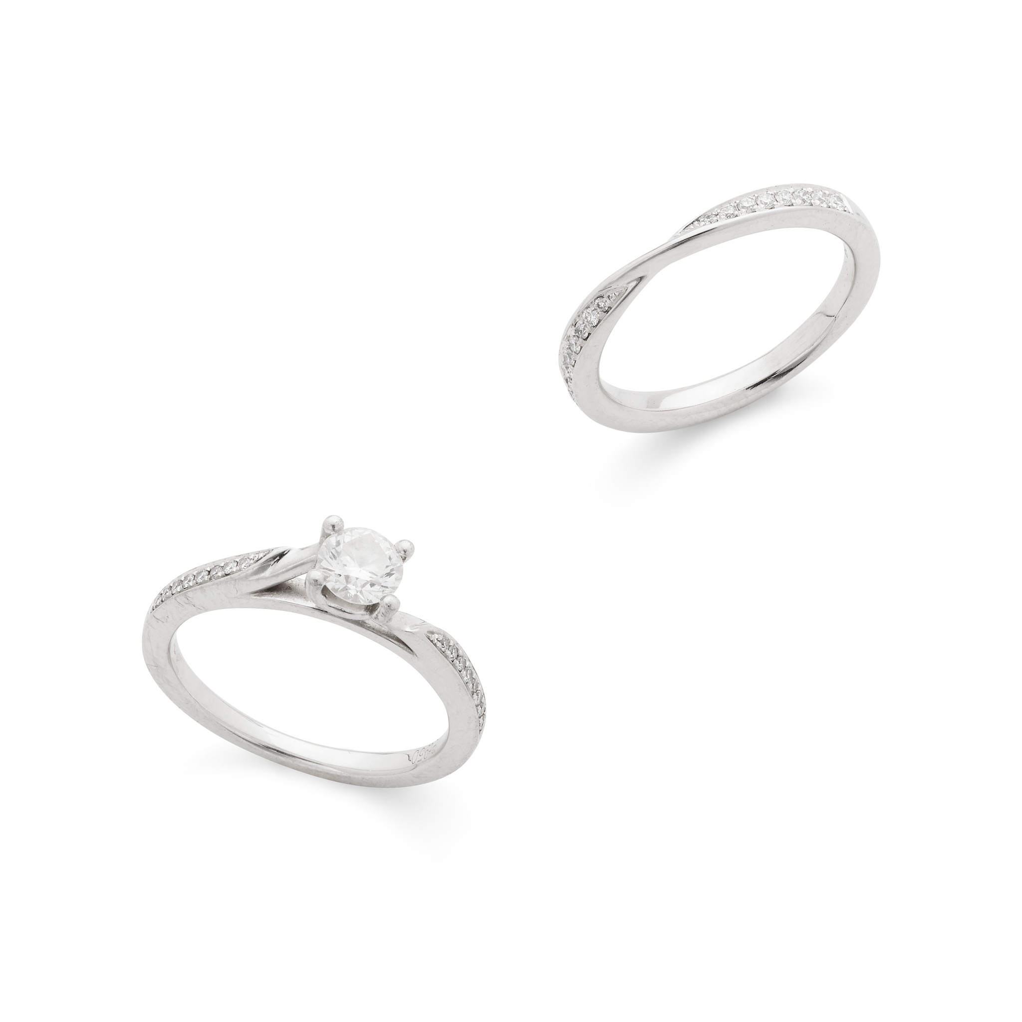 claw-set with a brilliant-cut diamond, between brilliant-cut diamond shoulders, mounted in platinum, together with a matching half-eternity band, mounted in platinum