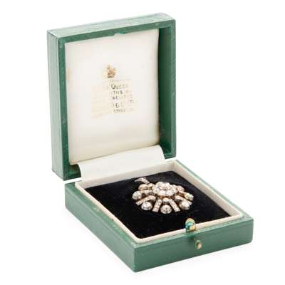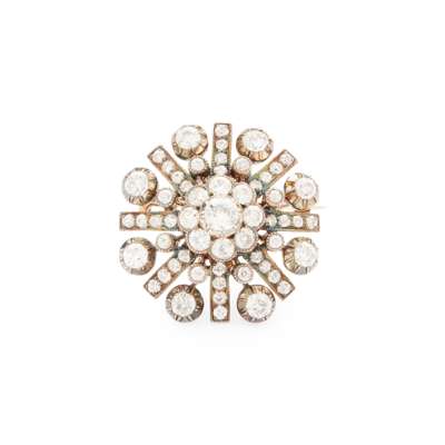 the old brilliant-cut diamond cluster within a radiating surround of old brilliant-cut diamond bars and two-stones, unmarked, detachable brooch and pendant fittings; in a fitted box for Garrard & Co