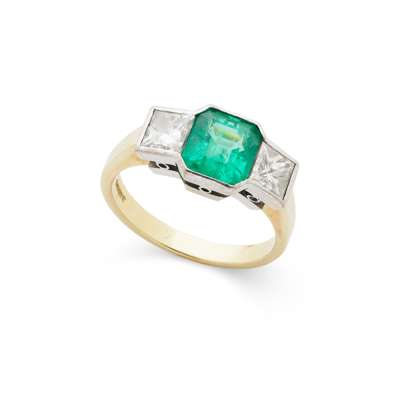 collet-set with a cut-cornered square-cut emerald and two princess-cut diamonds, modelled in 18ct gold