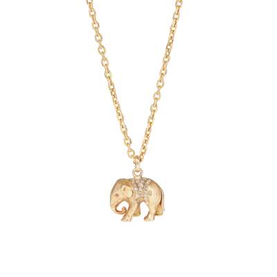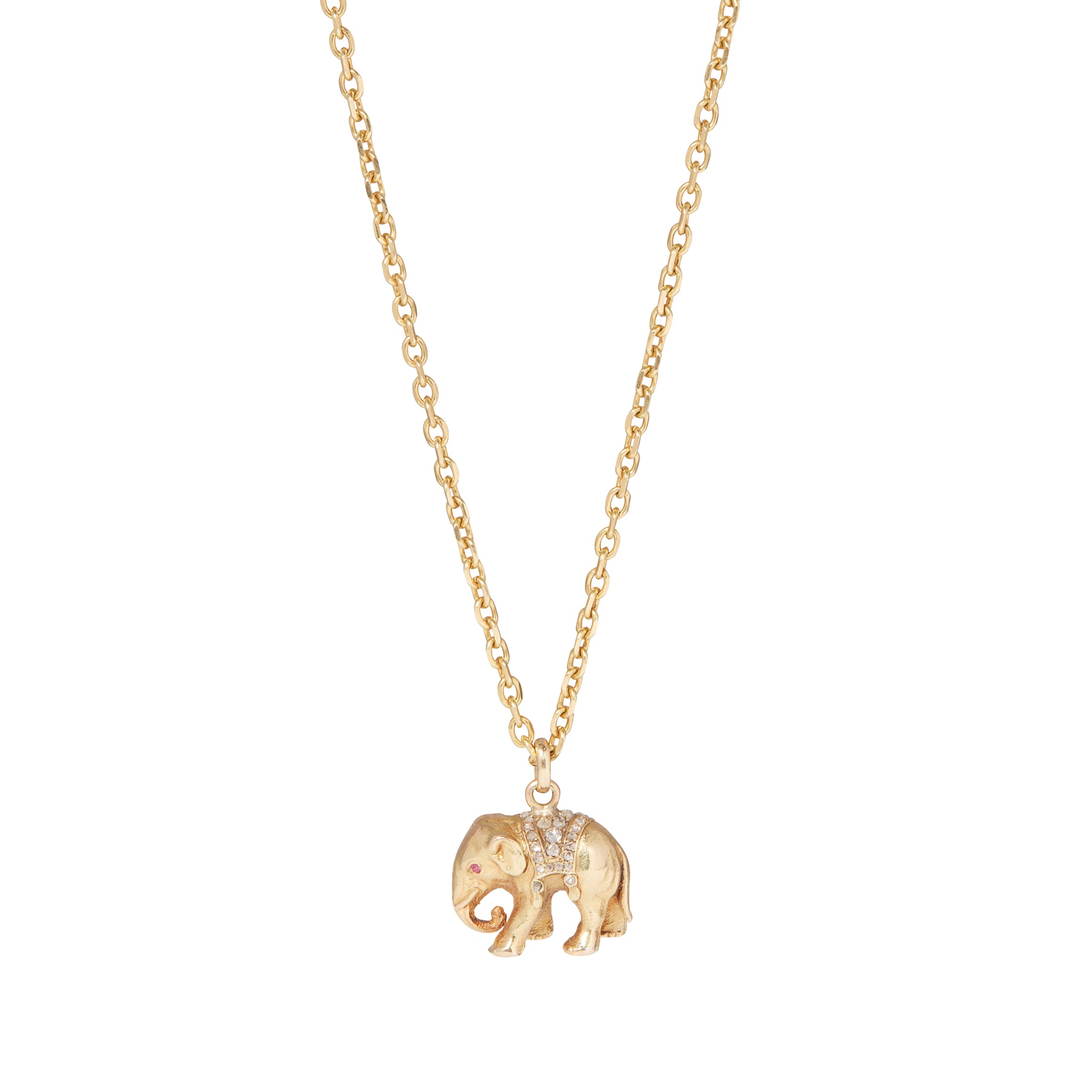 modelled as an elephant with rose-cut diamond and circular-cut ruby detail, unmarked; suspended from a belcher-link chain, indistinctly marked