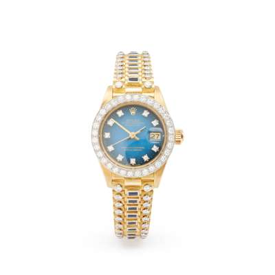 Oyster Perpetual Datejust model 6917, c.1979 from serial number between lugs, case with European convention mark for 18ct gold, signed Rolex Perpetual movement, signed round gradient blue dial with diamond dot hour markers, date aperture at 3, gold pencil hands, centre seconds hand, after-market diamond bezel, screw-down crown with coronet, on a President bracelet strap after-market set with a central row of baguette cut sapphires flanked by two rows of brilliant cut diamonds, with a Rolex signed concealed 18ct gold clasp, in box, with papers, with additional loose dial