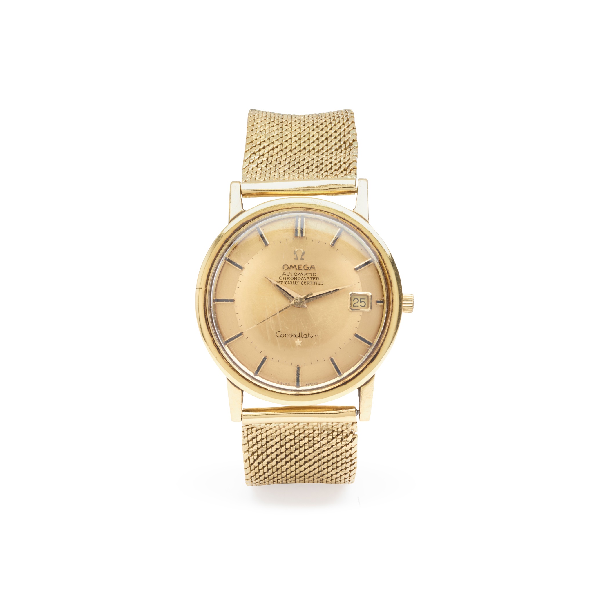 Omega Automatic Constellation model, 18ct gold case, signed Omega calibre 561 automatic movement, round champagne pie pain dial, applied black and gold baton hour markers, date aperture at 3, inner seconds track, gold sword hands with black inserts, gold centre seconds hand, caseback with full Birmingham hallmarks for 1963, generic metal crown, on a gold mesh bracelet with signed Omega foldover clasp, no box and papers