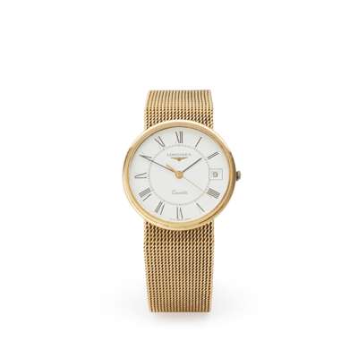 1980s, 9ct gold case with European convention mark, quartz movement, round white dial with Roman numerals in black, date aperture at 3, inner railroad seconds track in black, gold pencil hands, centre seconds hand, metal crown with Longines winged logo, on an integrated gold mesh bracelet with Longines signed foldover clasp, in box, no papers