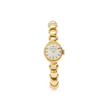 1960s, 18ct gold case with Swiss Helvetia head mark to the interior, signed JLC manual wind movement, round silver-coloured dial with applied gold Arabic 12 and 6 and baton hour markers, gold sword hands, crown with JLC logo, caseback with serial number, on an ornate bracelet strap formed by alternating full and cut-out links, with a foldover clasp marked 750, in box, no papers