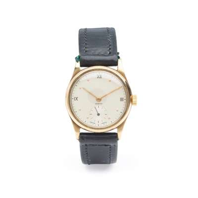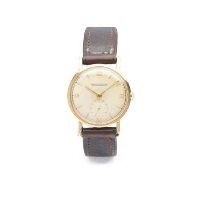comprising a Jaeger-LeCoultre 9ct gold wristwatch, signed JLC manual wind movement, signed dial with applied gold Arabic numerals and wedge hour markers, sunken small seconds at 6, outer seconds track in black, gold sword hands, recessed crown, the caseback with 8226, the caseback interior with full London hallmarks for 1956 and DTE, on a generic strap, no box and papers; and a Zenith 9ct gold wristwatch with signed Zenith manual wind movement, round dial with Roman numerals in black and got dot hour markers, sunken small seconds at 6, outer seconds track in black, gold pencil hands, the caseback interior signed Dennison ALD and with model and serial numbers along with full Birmingham hallmarks for 1949, on a generic strap, no box and papers