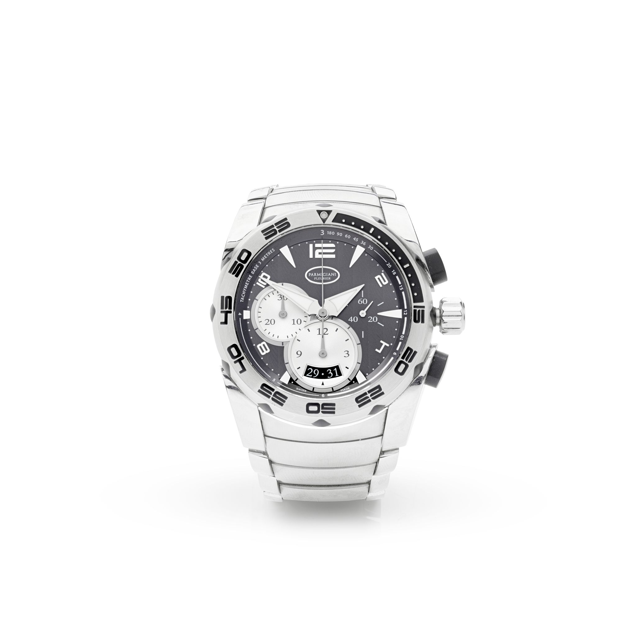 Pershing 660 Feet model, stainless steel case, automatic movement, round black dial with applied stainless steel Roman numerals and triangular hour markers, subsidiary seconds at 6, sunken 12 hour register at 6 with date aperture cut out, 30 minute register at 9, dot outer seconds track, stainless steel bezel with count up scale in black, crown with PF logo flanked by twin rounded rectangular black push buttons, the caseback with Pershing and ship logo and 660 FEET, with No. 35175 below, on a stainless steel bracelet strap with deployant clasp with PF logo to the exterior, no box and papers