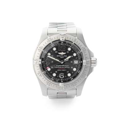 Super Ocean model A17390, stainless steel case, automatic movement, applied stainless steel 12, 3, 6 and 9 and lume plot hour markers, railroad outer seconds track in white, inner 24 hour scale, outer count-up scale to rehaut, stainless steel sword hands with lume inserts, centre seconds hand with red arrow terminal, stainless steel bezel with count-up scale, screw-down crown with Breitling logo, caseback with model and serial numbers , on a stainless steel bracelet with 134A to the end links, and W2410 to the first links, with a Breitling signed foldover clasp, no box and papers