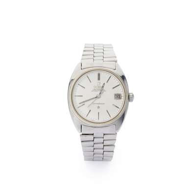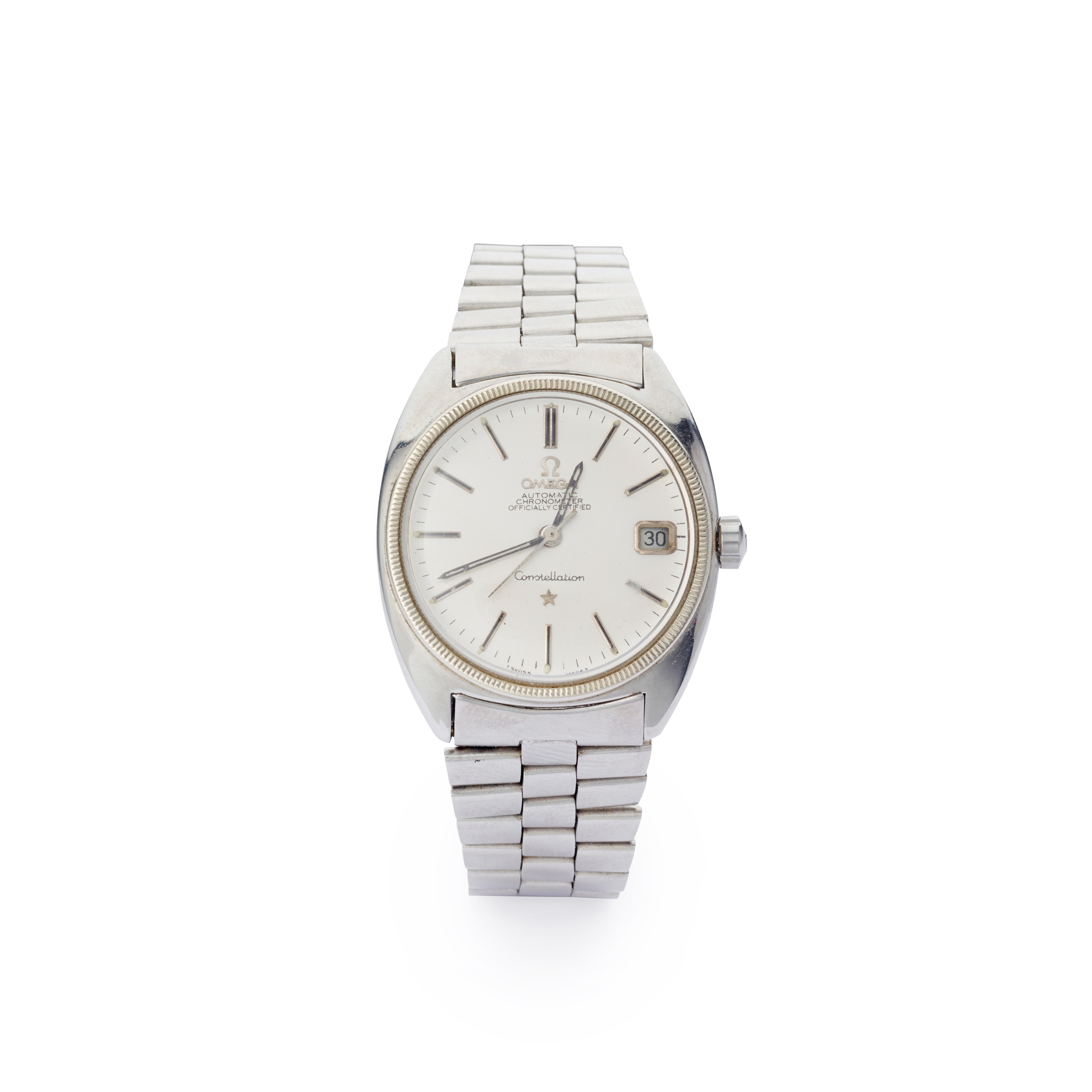 Constellation Automatic Chronometer model, stainless steel case, signed Omega calibre 561 movement, round silver-coloured dial with applied stainless steel baton hour markers, date aperture at 3, stainless steel pencil hands with lume inserts, centre seconds hand, coin edge bezel, crown with Omega logo, caseback with Omega observatory logo, on a stainless steel bracelet strap, with a foldover clasp, no box and papers - note, bracelet appears to be a copy
