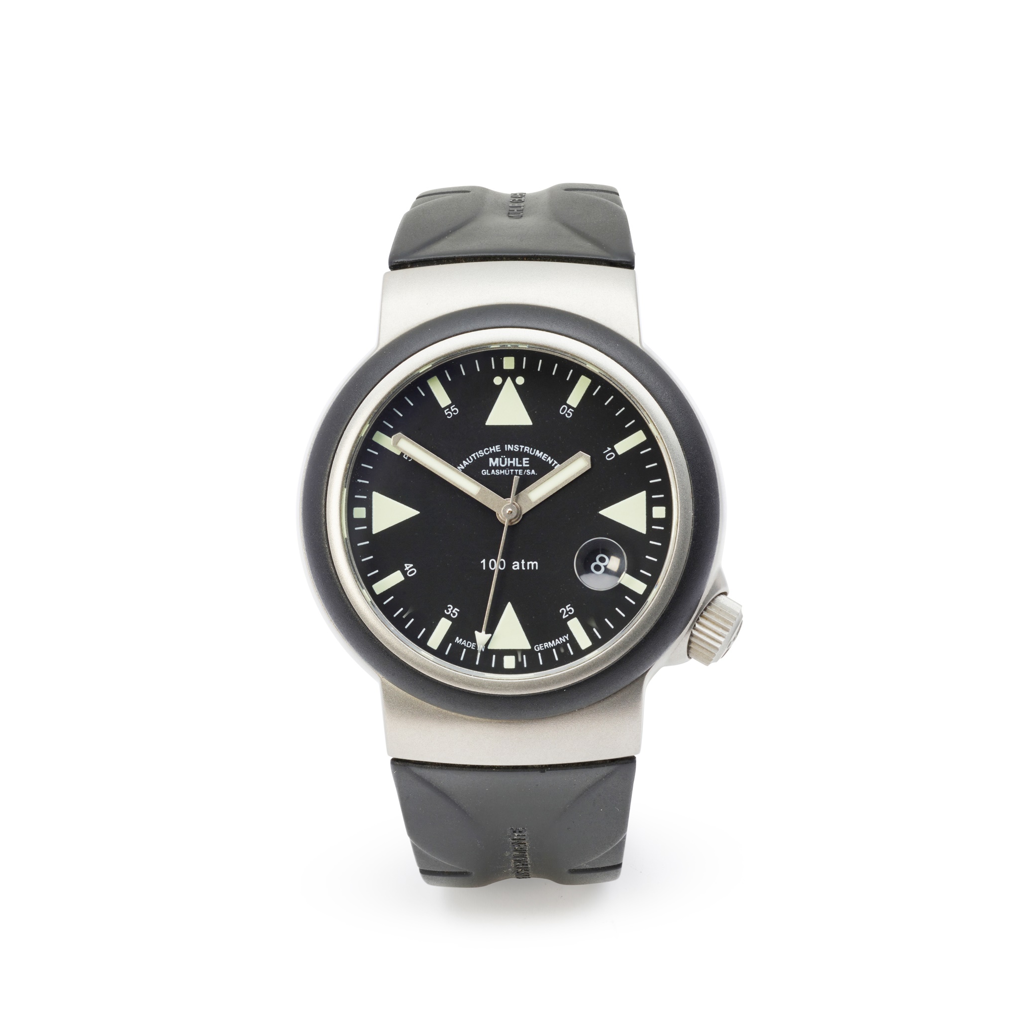 SAR Rescue Timer model M1-41-03, originally purchased 2022 from papers, stainless steel case, automatic movement, round black dial with lume triangle and baton hour markers, date aperture at 4, outer seconds track in white, stainless steel hands with lume inserts, centre seconds hand, screw-down crown at 4 with Mühle-Glashütte logo, case back with serial number, on a black rubber strap with Mühle-Glashütte signed deployant clasp, in box, with outer box, with papers and booklets and original purchase invoice