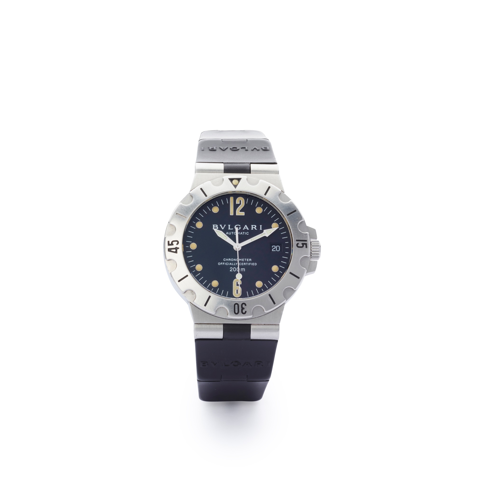 Scuba model SD 38 S, stainless steel case, automatic movement, round black dial with applied stainless steel-edged lume-filled Arabic 12 and 6 and plot hour markers, date aperture at 3, outer seconds track in white, stainless steel sword hands with lume inserts, centre seconds hand with lume plot, stainless steel bezel with count-up scale in black, with model and serial numbers to the caseback, on an articulated black rubber strap with Bulgari signed stainless steel deployant clasp, in box, no papers