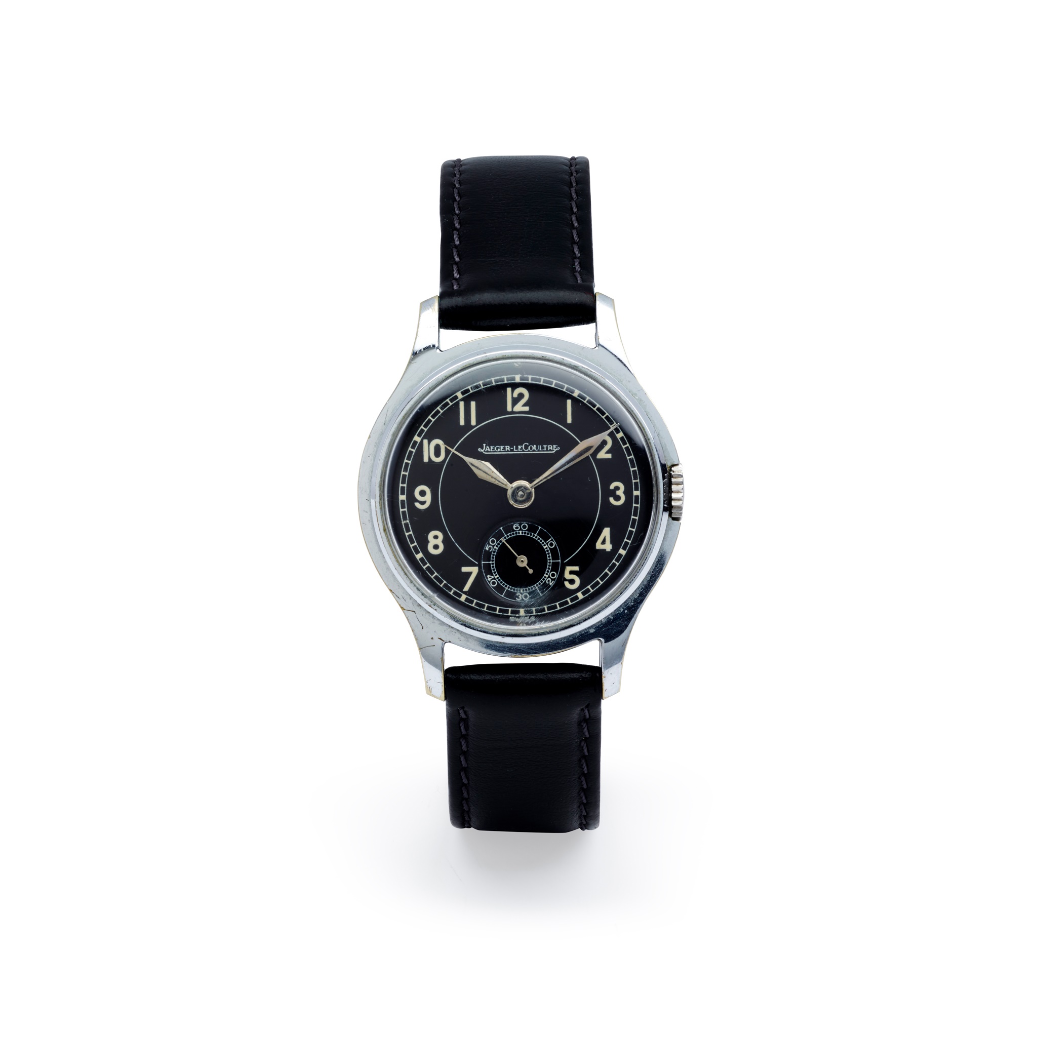 1940s, stainless steel case, signed JLC calibre P469/A manual wind movement, signed black dial with Arabic numerals in white, sunken small seconds at 6, railroad outer minutes track in white, stainless steel plume hands, case back with serial number, on a later generic strap, no box and papers