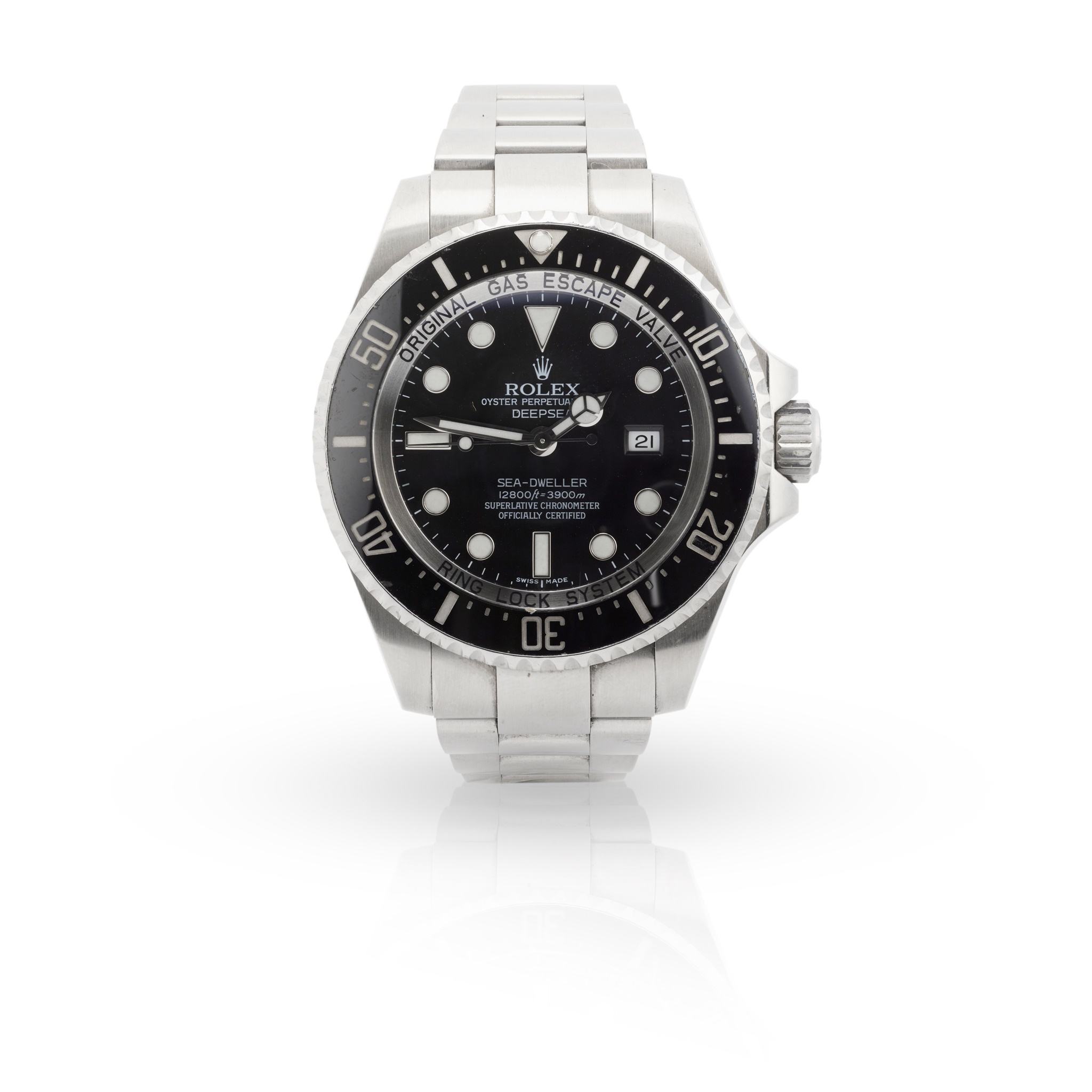 Oyster Perpetual Date Sea-Dweller Deepsea model 116660, 2008/9 from serial number to rehaut, stainless steel case, signed Rolex Perpetual calibre 3135 movement, round black dial with stainless steel-edged lume plots and markers, date aperture at 3, outer seconds track in white, lume-filled Mercedes hands, centre seconds hand with lume plot, black Cerachrom bezel with count-up scale, screw-down crown with coronet, helium scape valve, caseback with ROLEX OYSTER DEEPSEA SEA-DWELLER 12800 ft = 3900m, on a stainless steel Oyster bracelet strap with PJ 98210 to interior of the endlinks, with a signed Rolex Oysterlock clasp with PJ10 to the interior, no box and papers