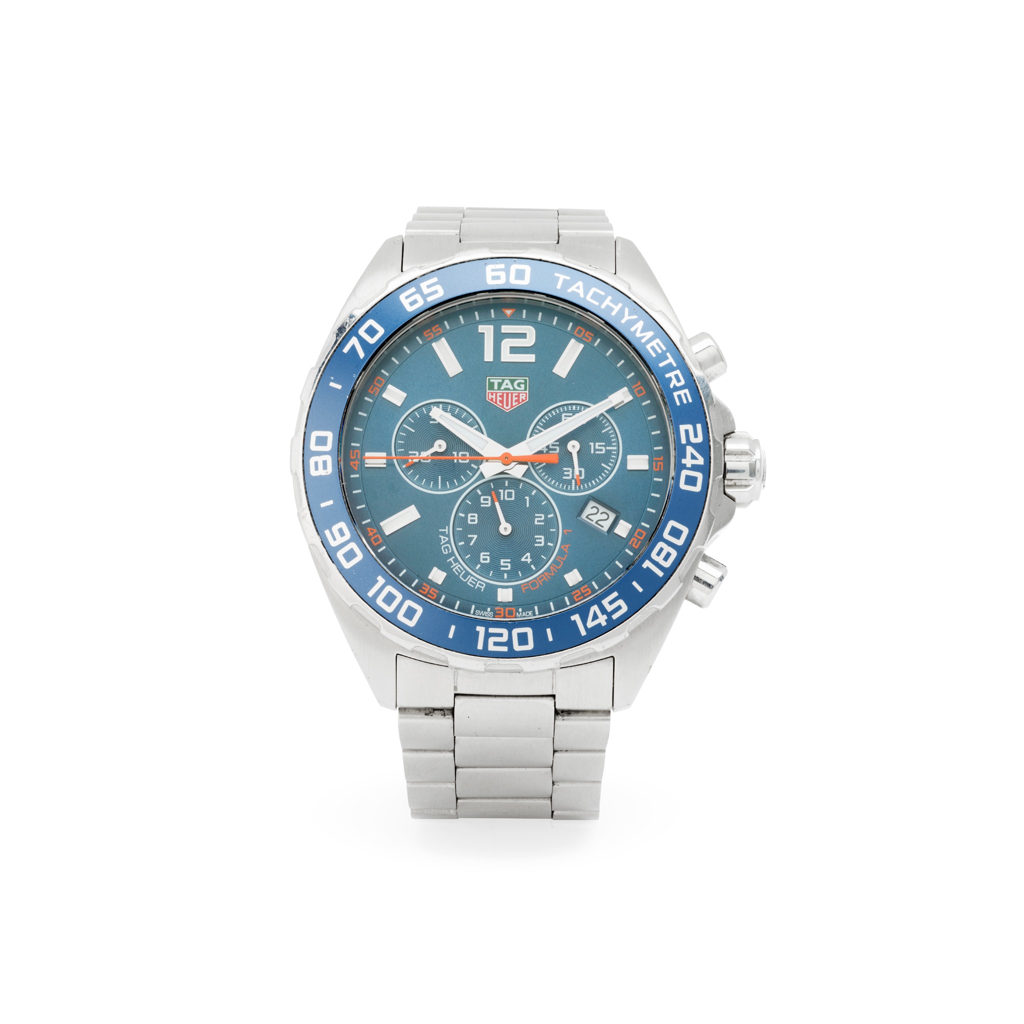 Formula 1 model CAZ1014, stainless steel case, quartz movement, round blue dial with lume-filled stainless steel hour markers, Arabic 12, subsidiary dials at 3, 6 and 9 for small seconds, 10ths of a second and 30 minute register respectively, outer seconds track in white with Arabic numerals in red, blue bezel with tachymeter scale, screw-down crown with TAG Heuer logo flanked by twin cylindrical push-buttons, caseback with model and serial numbers, on a stainless steel bracelet strap with signed TAG Heuer clasp marked W3G FAA 074, with additional links, in box, with papers, with partial outer box