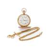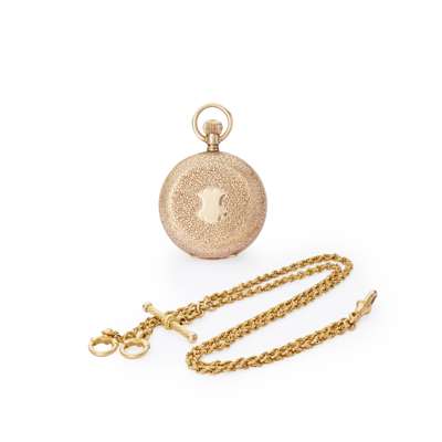 full hunter, keyless wind, unsigned movement, round white enamel signed L. F. Tissot, Geneve, Roman numerals in black, sunken small seconds at 6, railroad outer minutes track in black with Arabic numerals, ornate pierced gilt hands, caseback with engraving and central blank shield motif, along with chain with two lobster clasps and a bar, each marked 18
