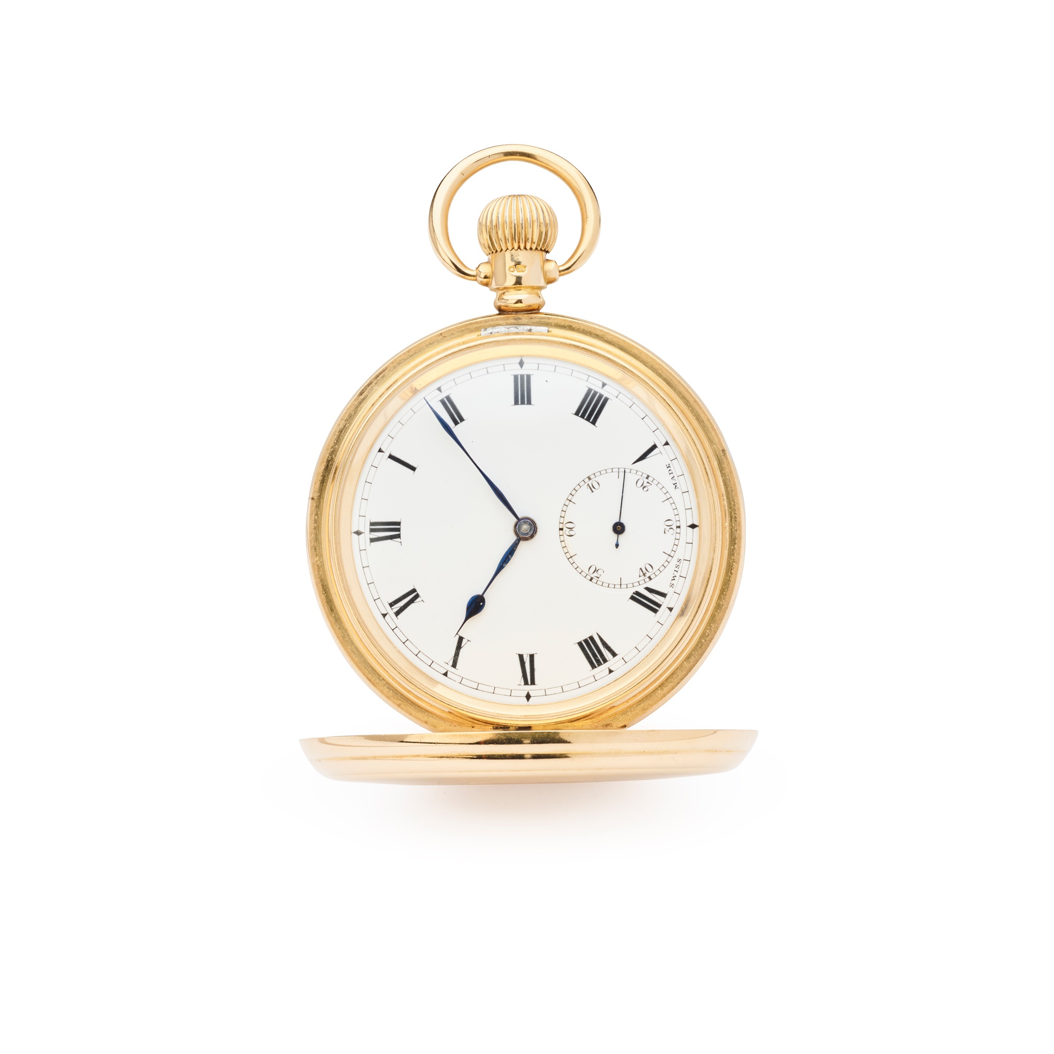 full hunter, keyless wind, signed Dennison case with full Birmingham hallmarks for 1922, signed Zenith movement numbered 1115360, round white enamel dial with Roman numerals in black, sunken small seconds at 6, blued steel leaf hands, railroad outer seconds track in black, movement cover with personalised inscription dated 1923, case with engraved monogram RWP