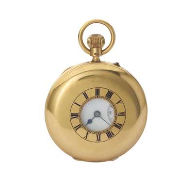 half hunter, keyless wind, unsigned 3/4 plate movement, casefront with central aperture surrounded by enamelled numerals in blue, inner railroad minute track, white enamel dial with Roman numerals in black, sunken small seconds at 6 with Arabic numerals in black, blued steel leaf hands, movement cover with personalised inscription dated 1914, with full London hallmarks for 1913 to the caseback interior