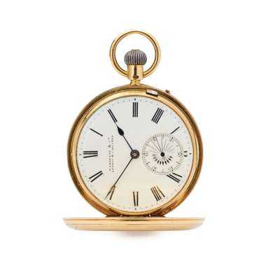 full hunter, keyless wind, Hamilton & Co. signed 3/4 plate movement, signed white enamel dial with Roman numerals in black, sunken small seconds at 6, railroad outer minutes track in black, blued steel leaf hands, machined engraving to casefront, interior with personalised inscription to the interior dated 1885, the caseback with full hallmarks for 1877