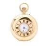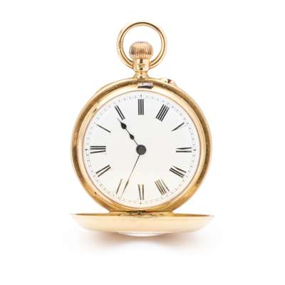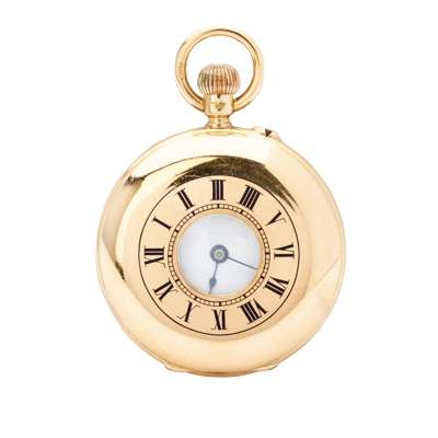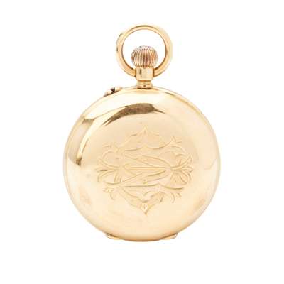 18ct gold case with full London hallmarks for 1886, unsigned 3/4 plate movement, casefront with Roman numerals enamelled in black around aperture, round white enamel dial with Roman numerals in black, railroad outer seconds track in black, blued steel leaf hands, caseback with engraved monogram