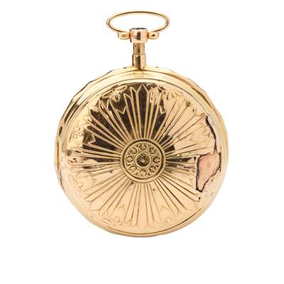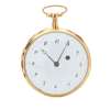 open face, key wind, quarter repeater, unsigned French movement, round white enamel dial with Arabic numerals in black, railroad outer seconds track in black, pierced blued steel hands, the caseback with engraved decoration and with A.R. 5570, metal movement cover