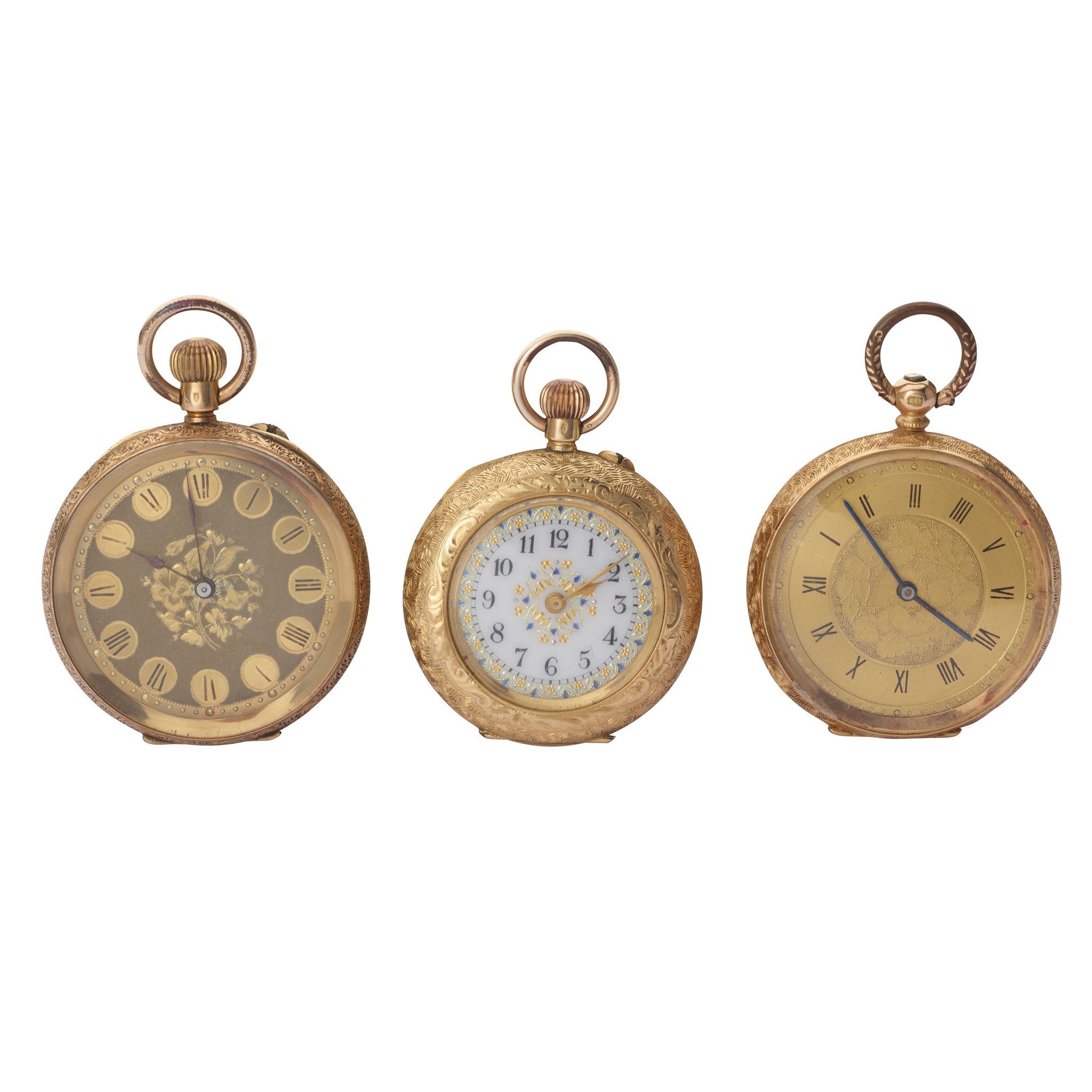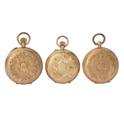 all continental, including one with a white enamel dial with central section of gold and blue decoration, with decorative engraving to the case edge and caseback and numbered 179512 to the caseback interior