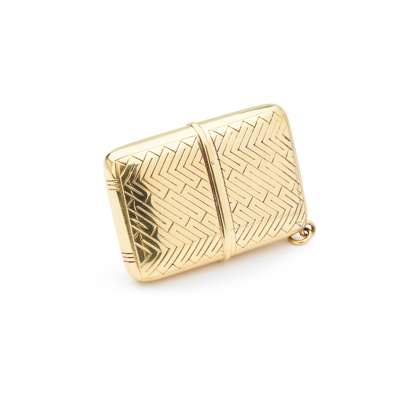 18ct gold case rectangular with Herringbone pattern, manual wind movement wound by action of opening and closing the case, the case opening to reveal a square dial with applied gold Arabic numerals, railroad outer seconds track in black, pierced gold hands, the case marked 18K, G.S and with full London hallmarks for 1928 with import mark