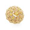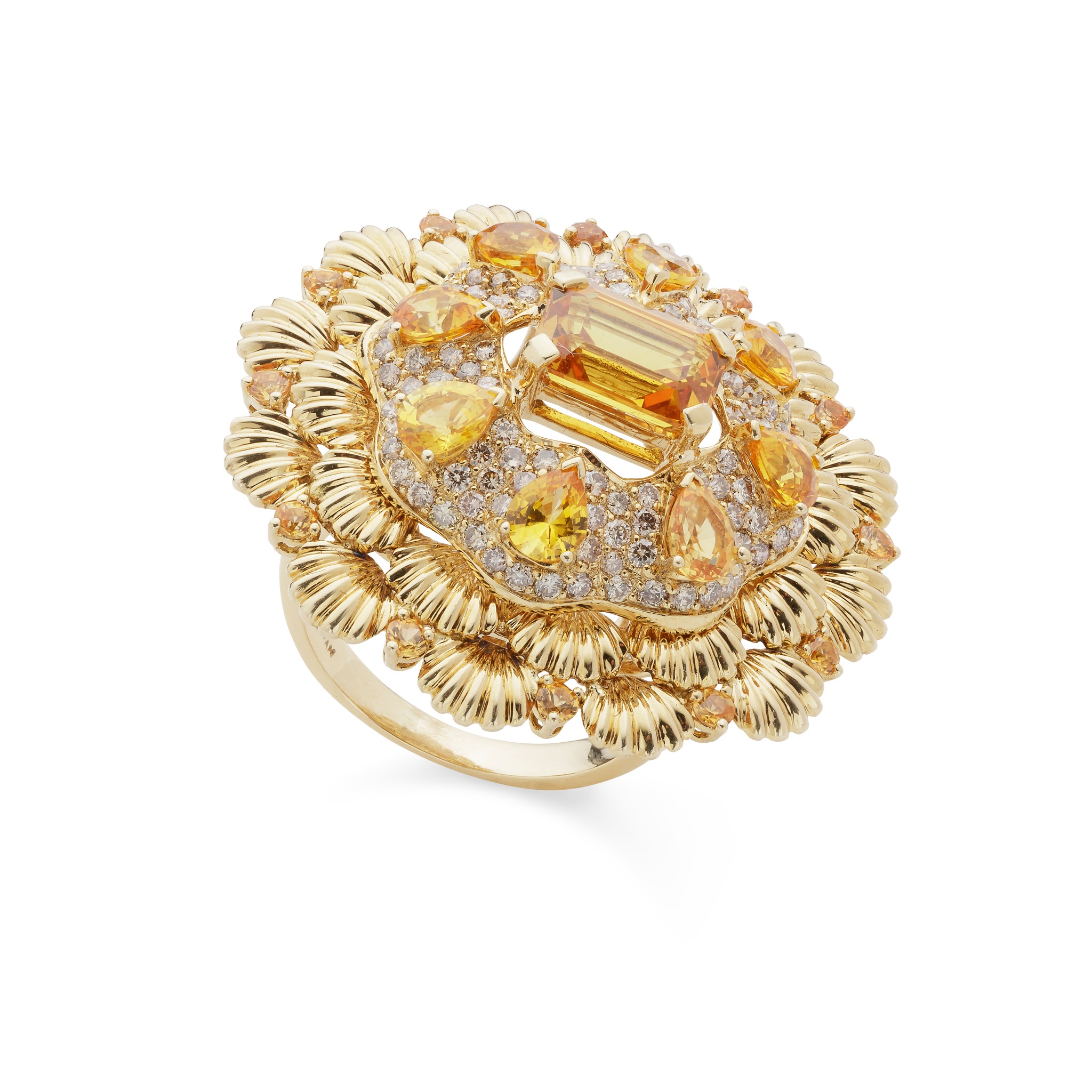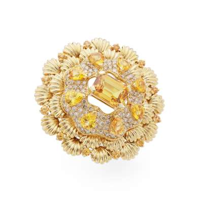 claw-set with a cut-cornered rectangular-cut citrine, in a bold floral border pavé-set with brilliant-cut diamonds and pear-shaped citrines, mounted in 18ct gold