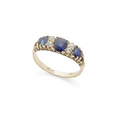 claw-set with three cushion-cut sapphires and four old brilliant-cut diamonds, indistinctly marked