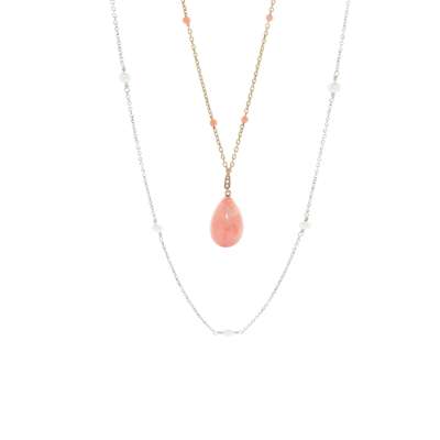 composed of a trace-link chain set at intervals with coral beads, suspending a large coral drop with seed pearl detail, stamped 15ct; together with a trace-link neck chain set at intervals with seed pearls, unmarked