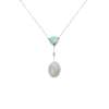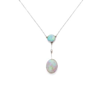 millegrain-set with two cabochon opals, the knife-edge bar links set with a single-cut diamond, to a trace-link chain, unmarked