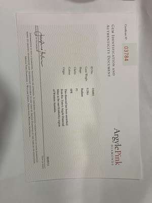Accompanied by a GIA report dated 31.01.12, numbered 2141305417, stating that the cut-cornered rectangular modified brilliant-cut diamond, weighing 0.28cts, is a natural fancy purplish-pink colour; also an Argyle Pink Diamonds Authenticity Document, dated 30th September 2011, no. 03784, stating that the diamond is 0.28cts, Radiant cut, P1 clarity, colour 6PR, confirming that it was unearthed in Rio Tinto's Argyle diamond mine in the east Kimberly region of Western Australia