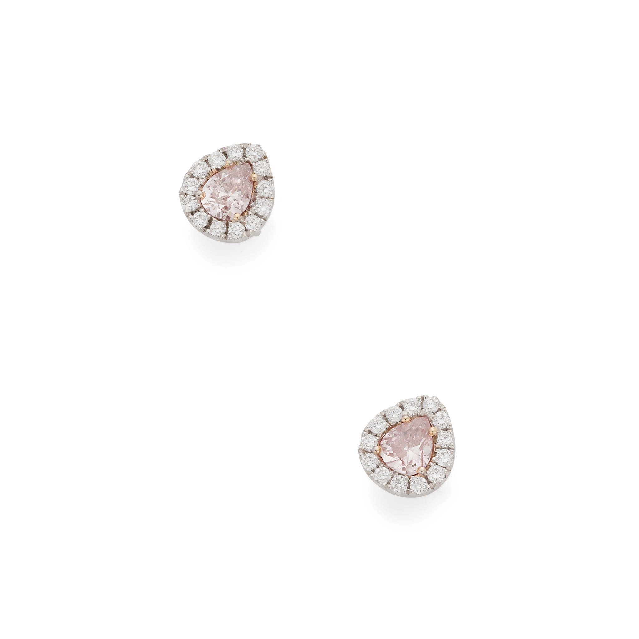 each pear-shaped pink diamond in a border of brilliant-cut diamonds, mounted in platinum, pink diamonds untested for natural colour