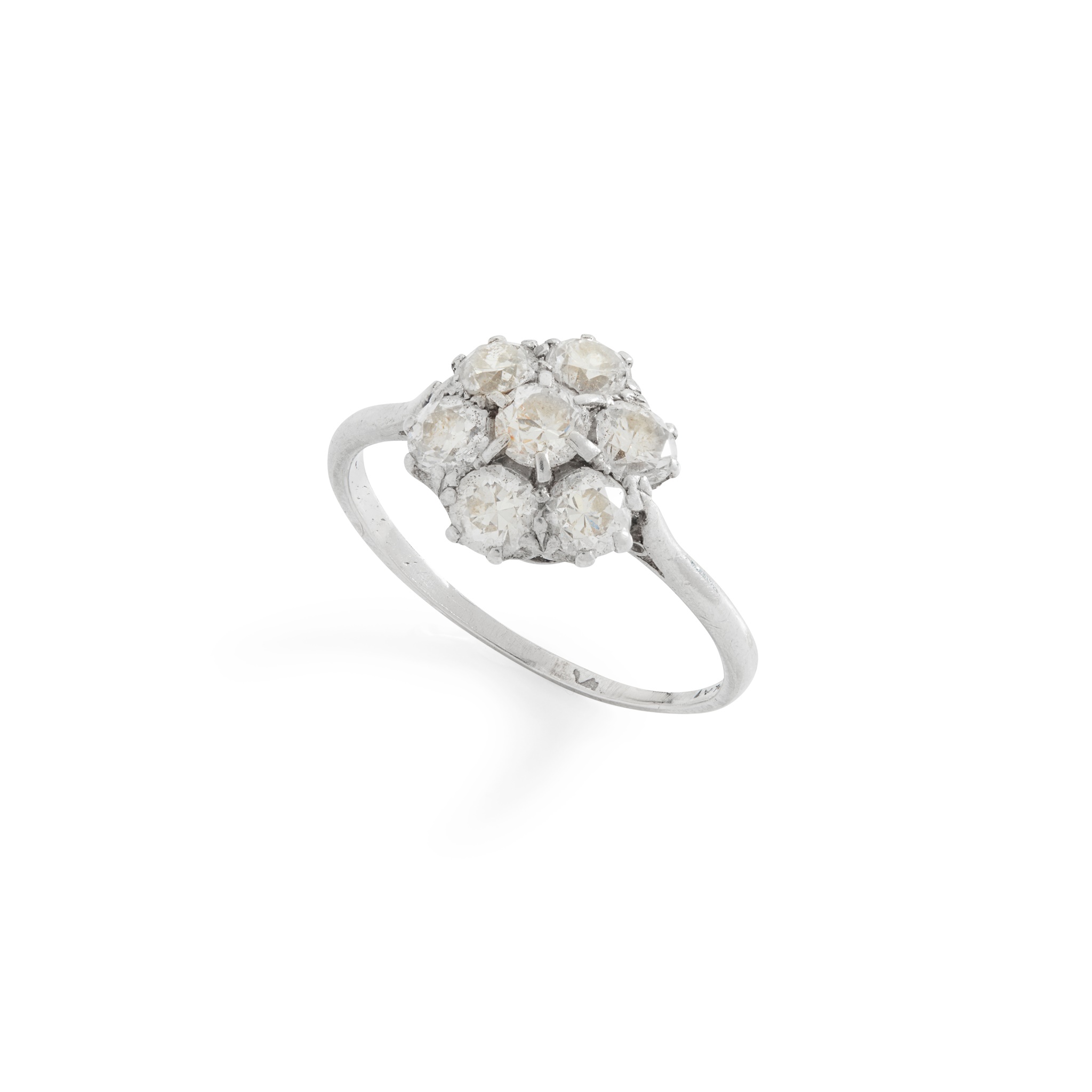 Claw-set with seven old round-cut diamonds, stamped PLAT