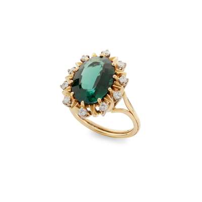 Claw-set with an oval mixed-cut green tourmaline, in a border of round brilliant-cut diamonds, unmarked