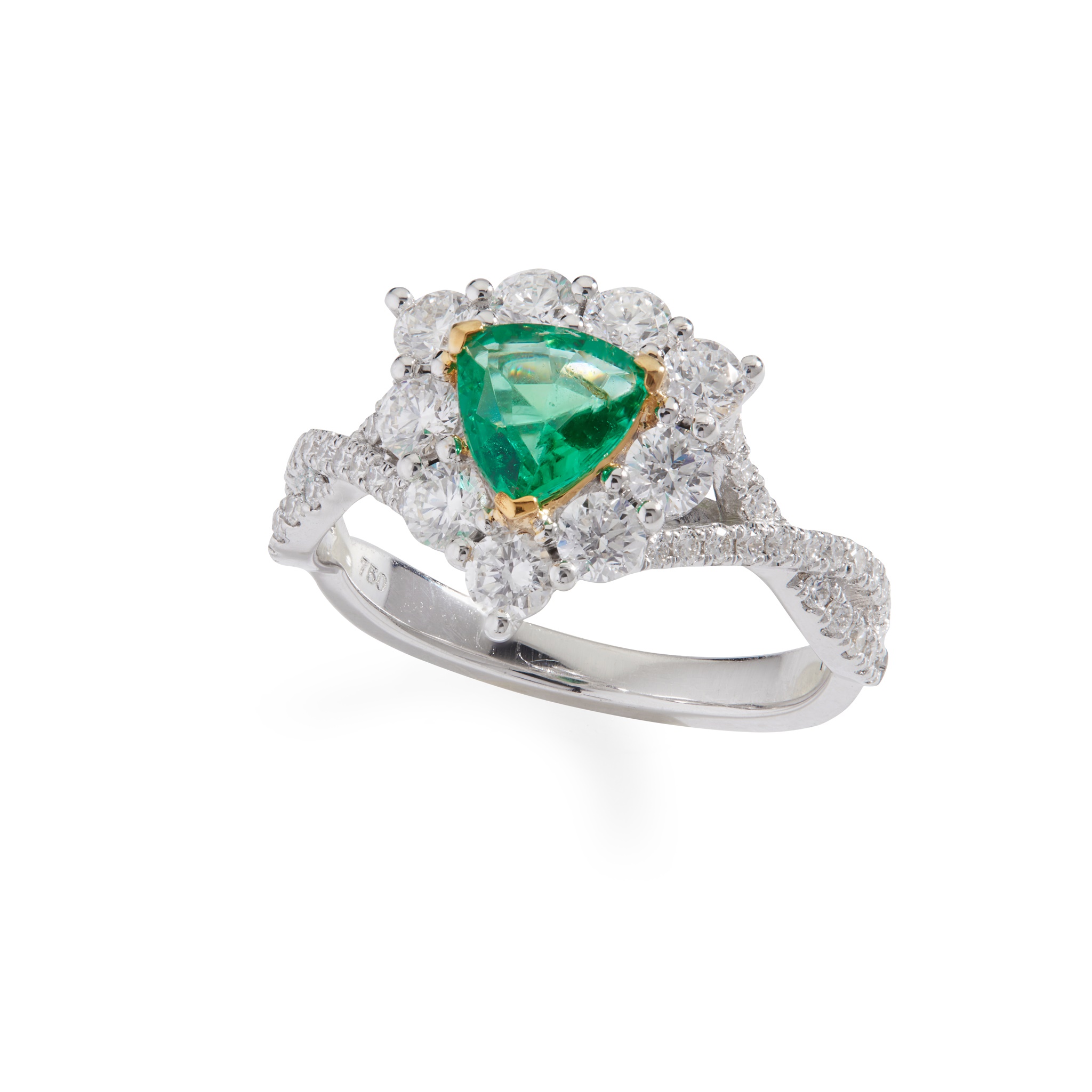 Claw-set with a trilliant-cut emerald in a border of round brilliant-cut diamonds, stamped 750