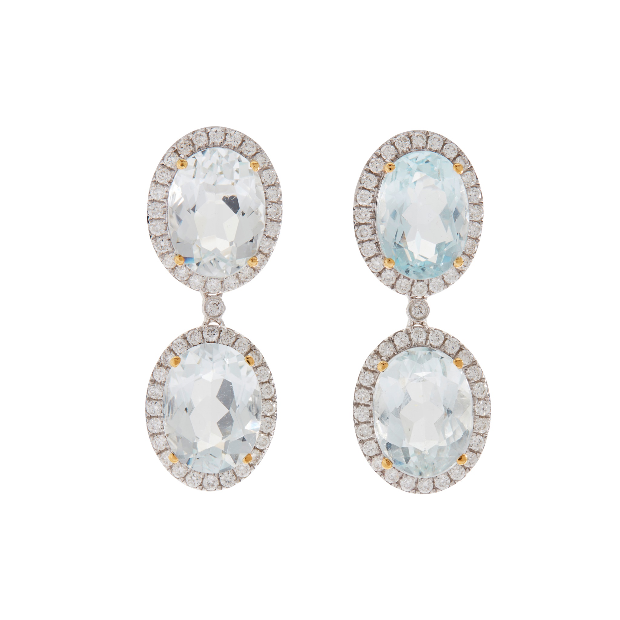 Each claw-set with an oval-cut aquamarine in a border of round brilliant-cut diamonds, post and butterfly fittings, stamped 750