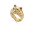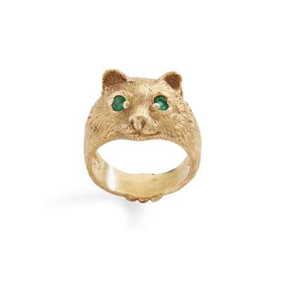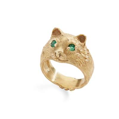 Modelled as a cat's face with textured detail, set with round-cut emerald eyes, stamped 750